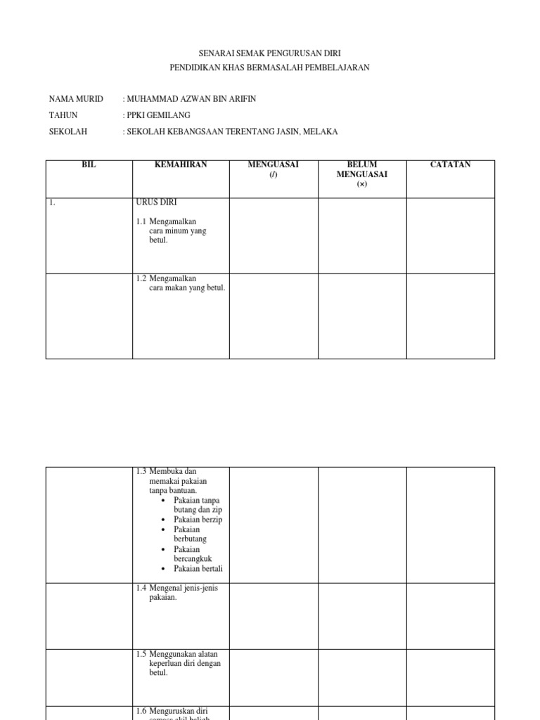 Senarai Semak Kemahiran Manipulatif Pendidikan Khas Tahun 2